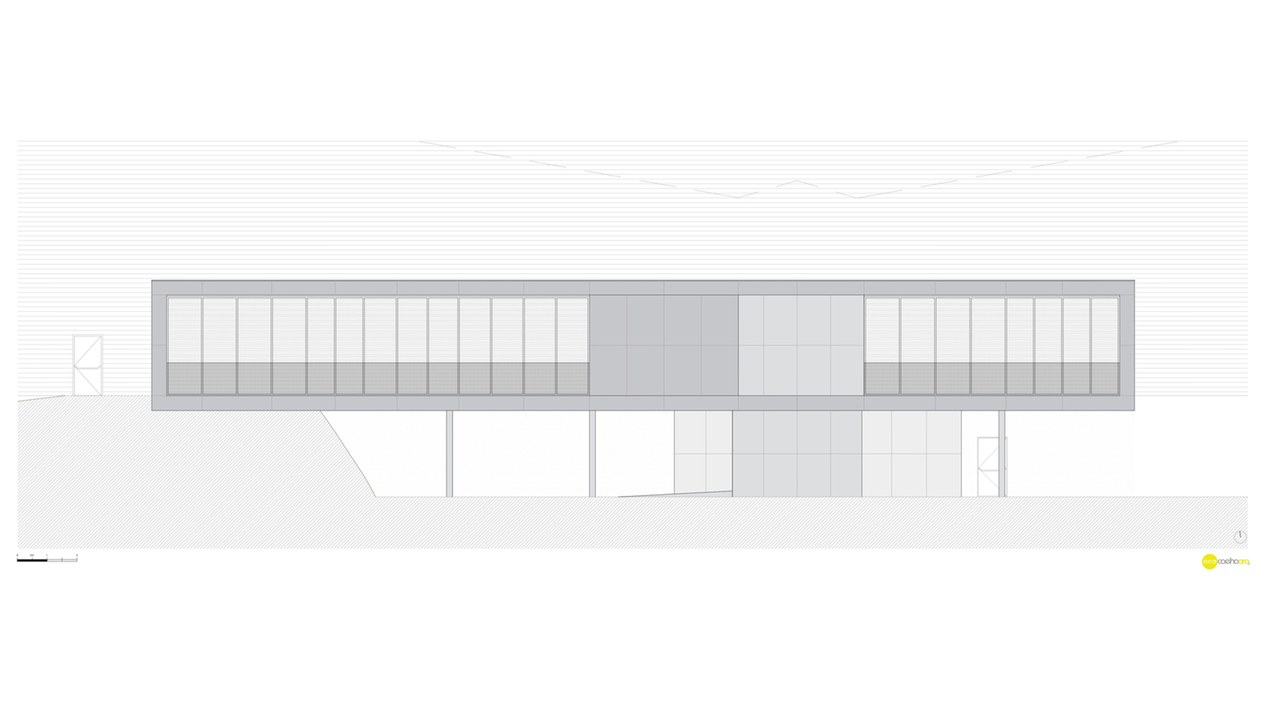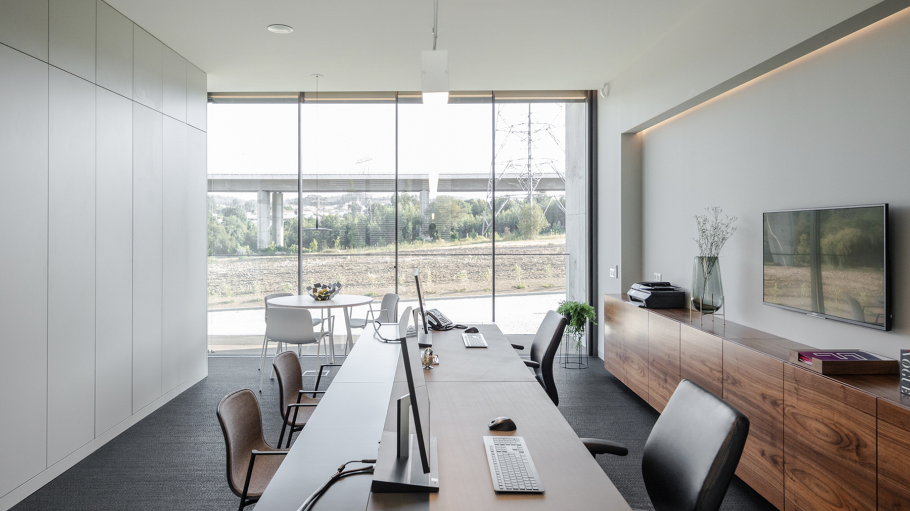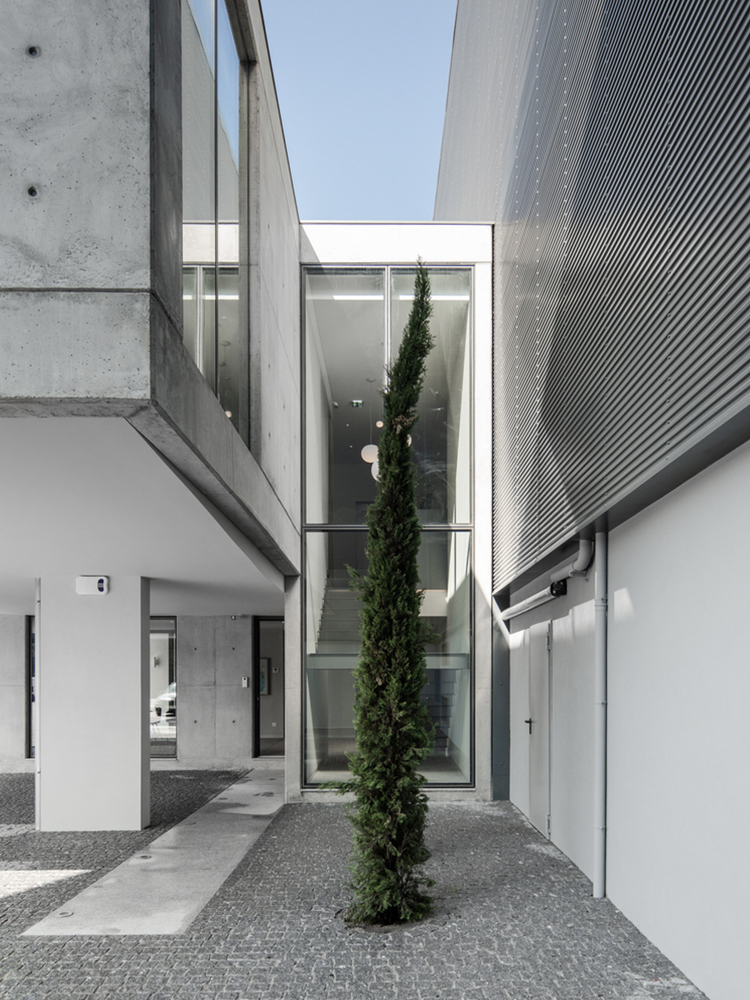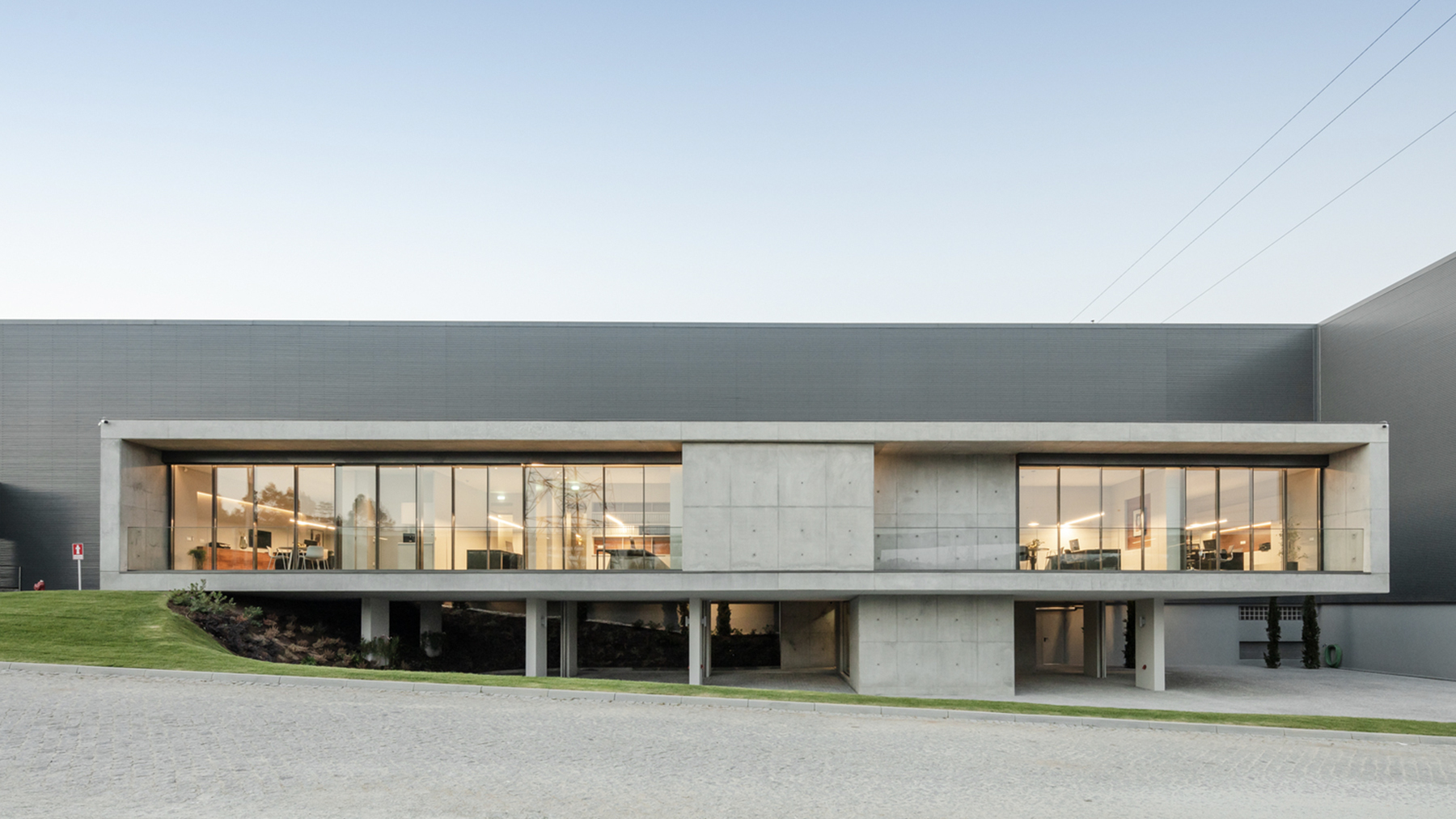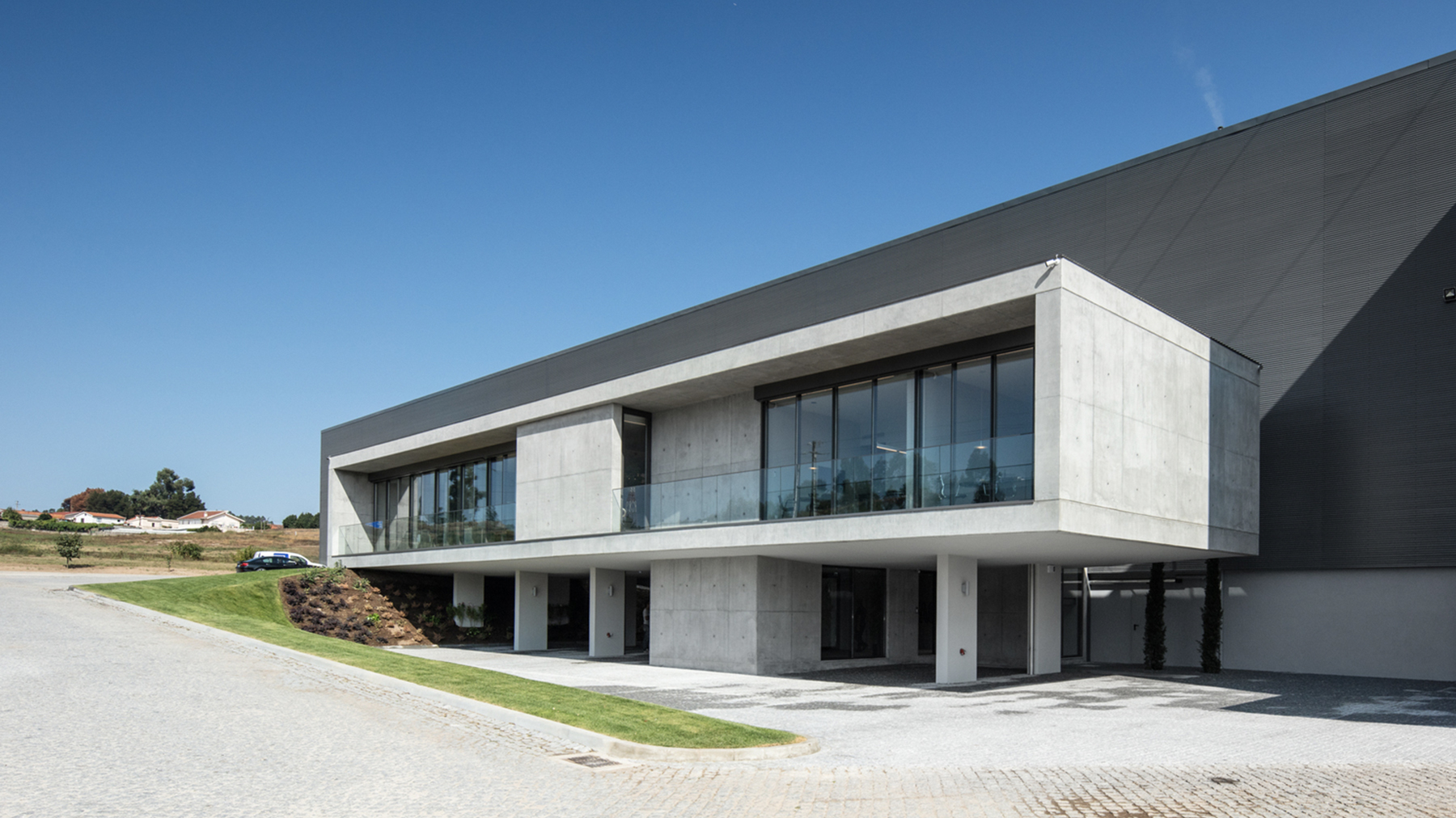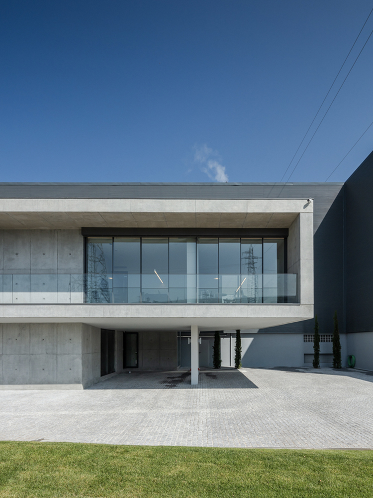 O edifício de escritórios surge como uma adição ao pavilhão inicial, ao qual se liga através de uma passagem generosa que concentra as circulações horizontais e verticais. Materializa-se num volume estendido de betão aparente, elevado sobre a zona de estacionamento que o serve.