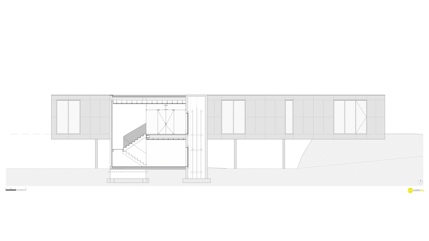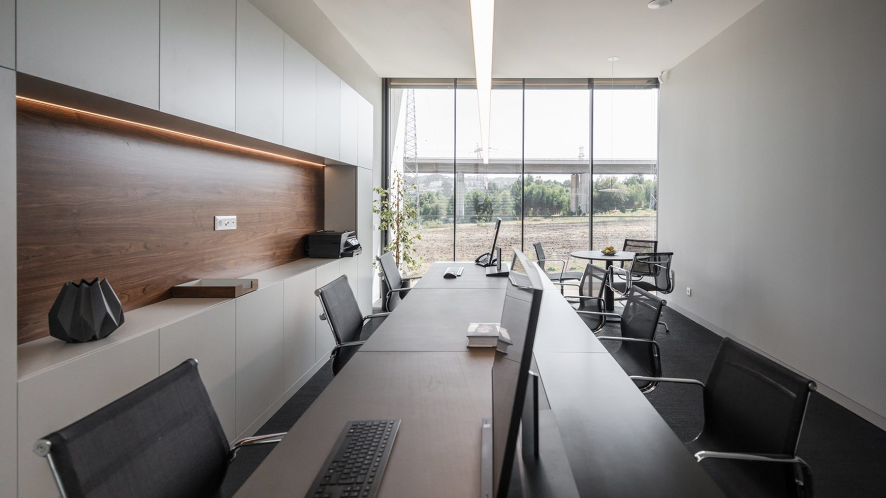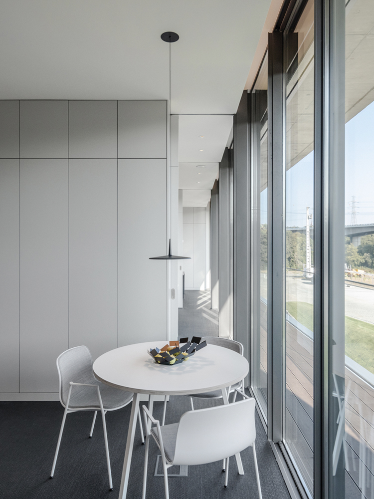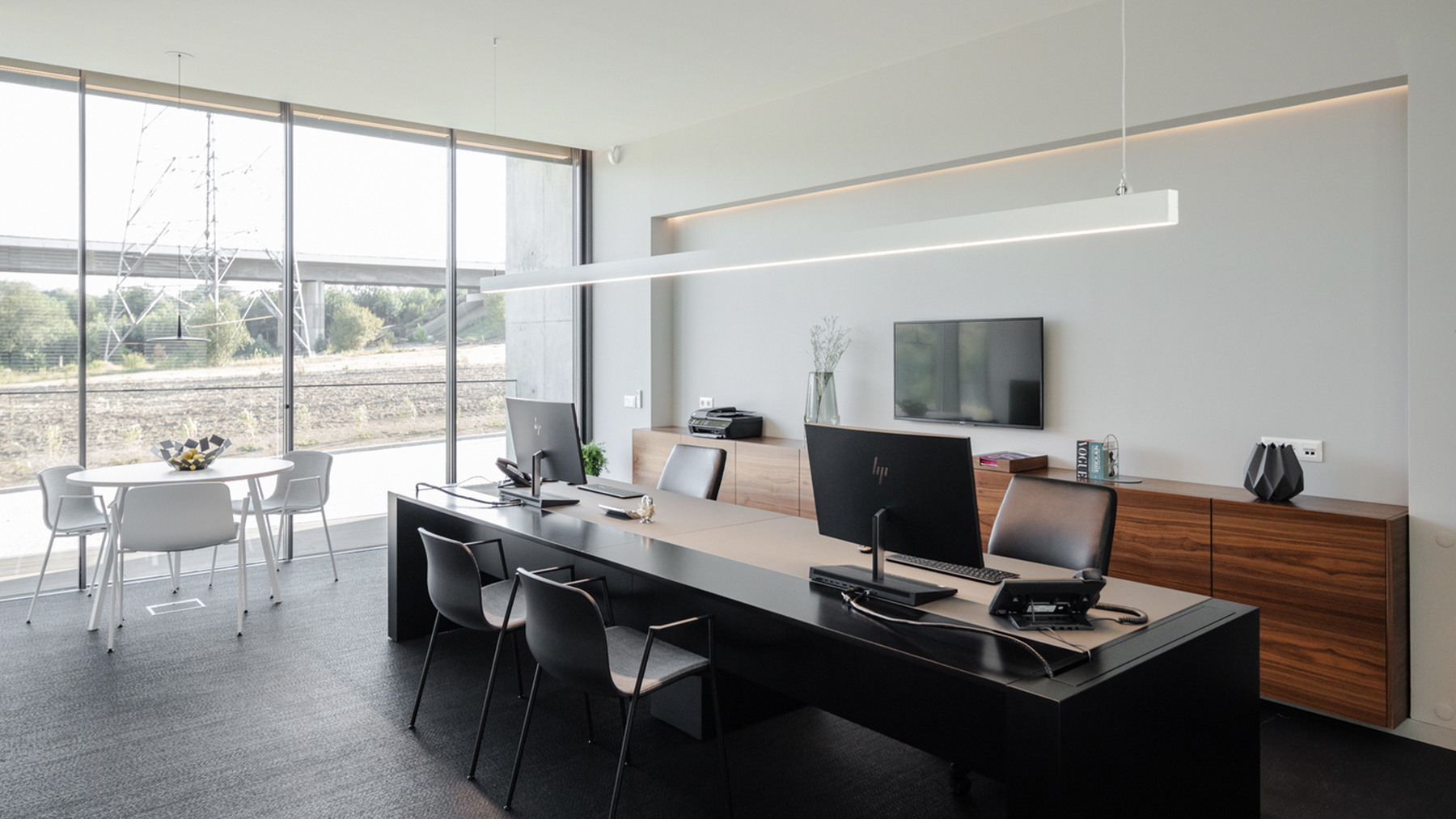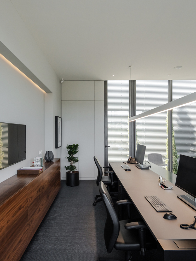 O edifício de escritórios surge como uma adição ao pavilhão inicial, ao qual se liga através de uma passagem generosa que concentra as circulações horizontais e verticais. Materializa-se num volume estendido de betão aparente, elevado sobre a zona de estacionamento que o serve.