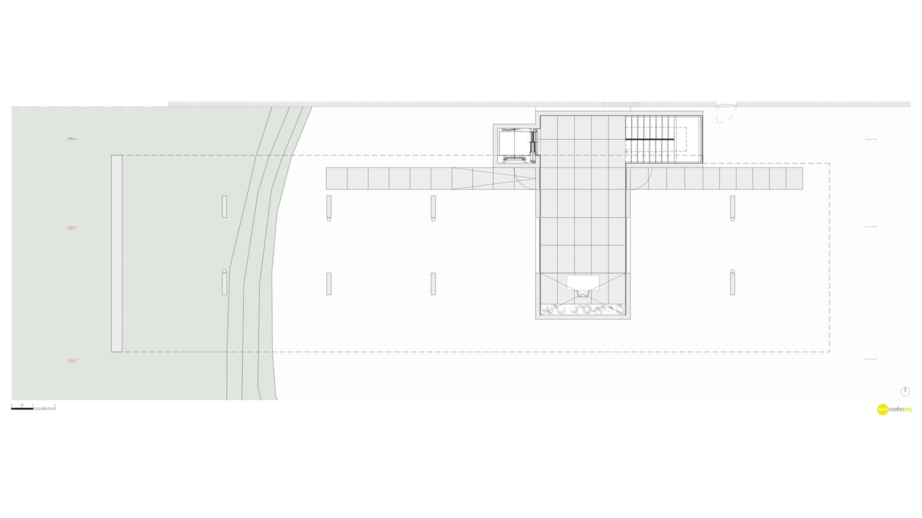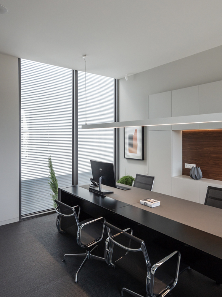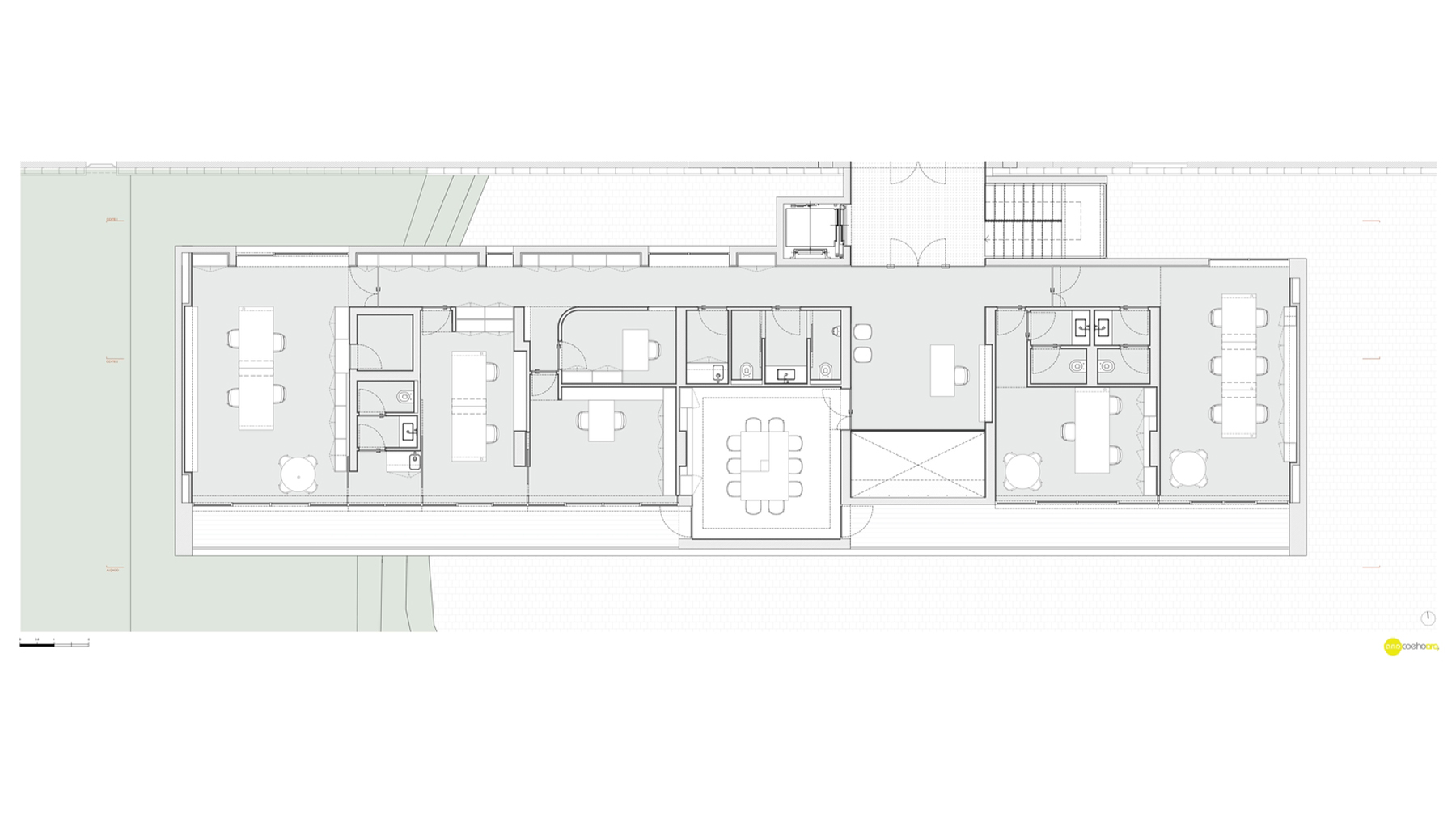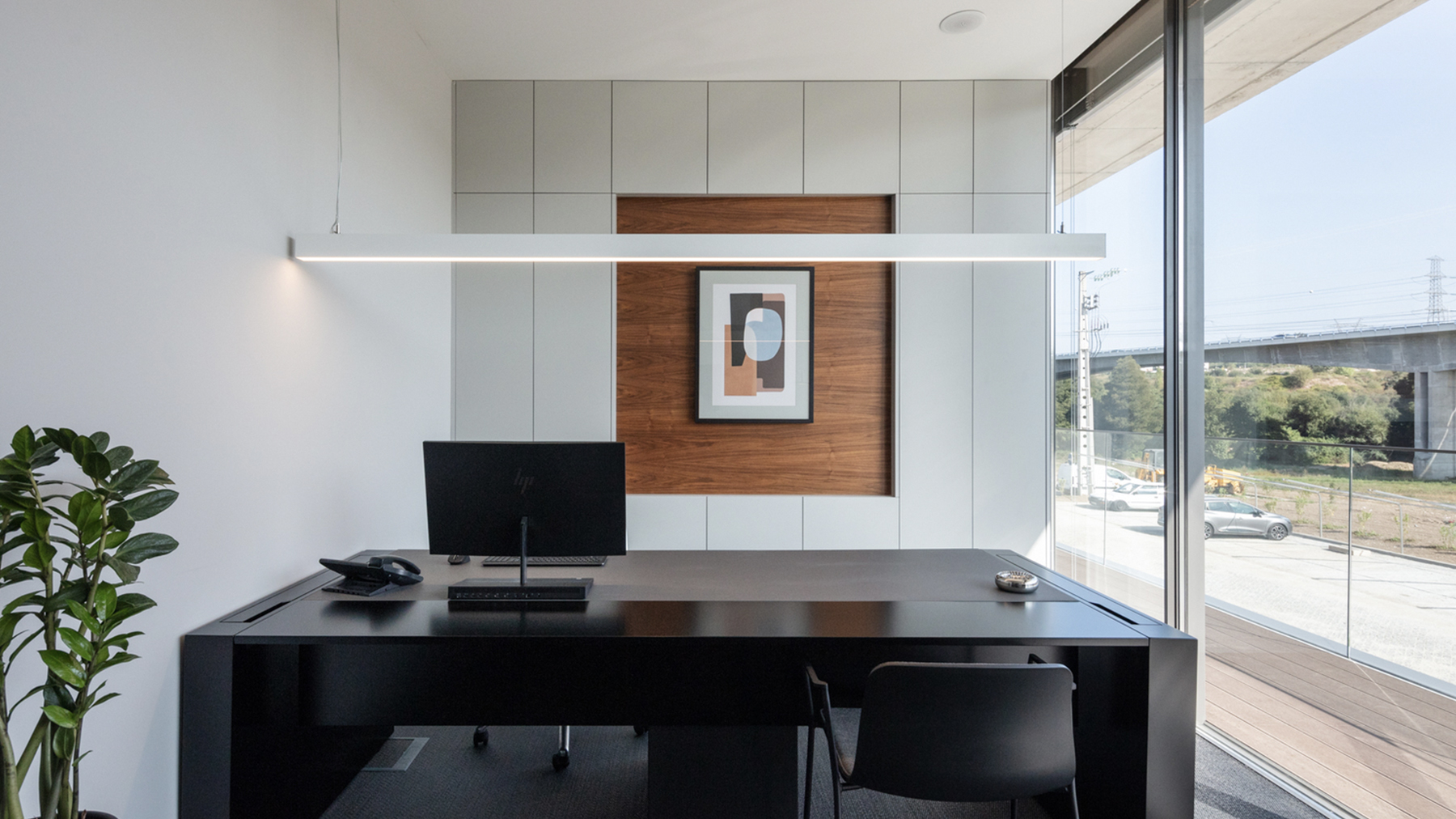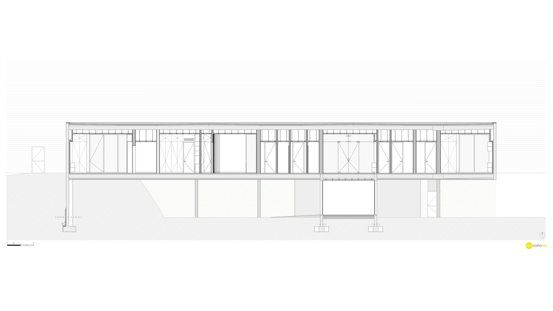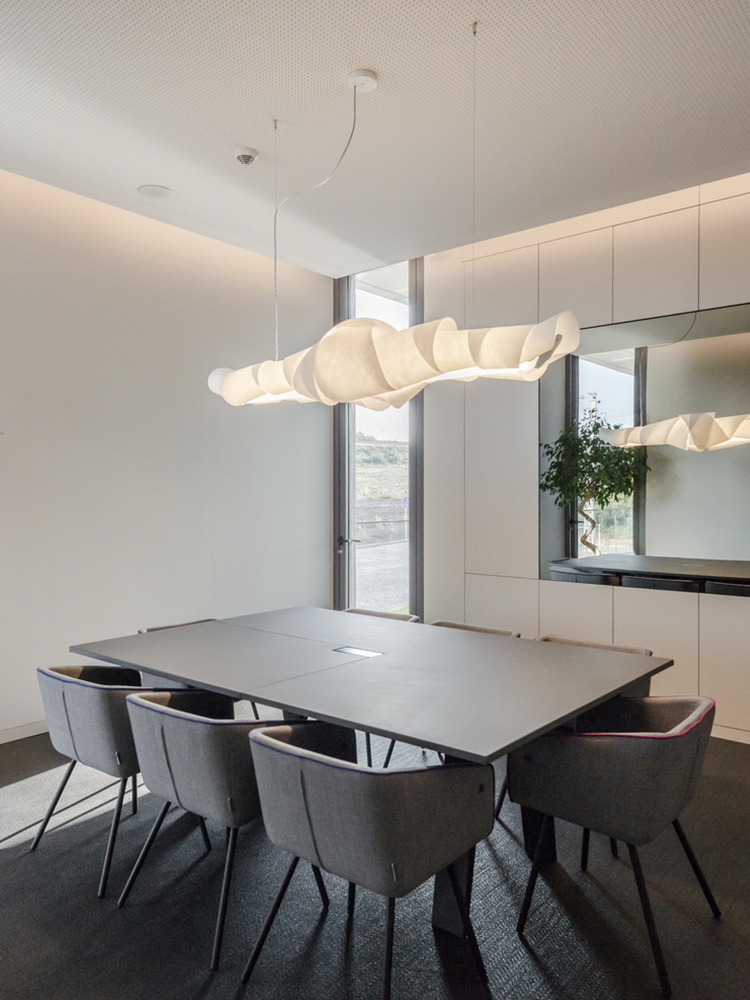 O edifício de escritórios surge como uma adição ao pavilhão inicial, ao qual se liga através de uma passagem generosa que concentra as circulações horizontais e verticais. Materializa-se num volume estendido de betão aparente, elevado sobre a zona de estacionamento que o serve.