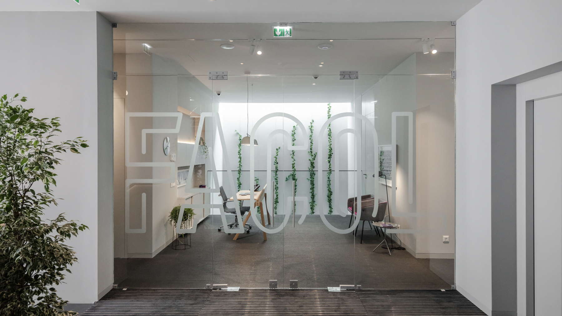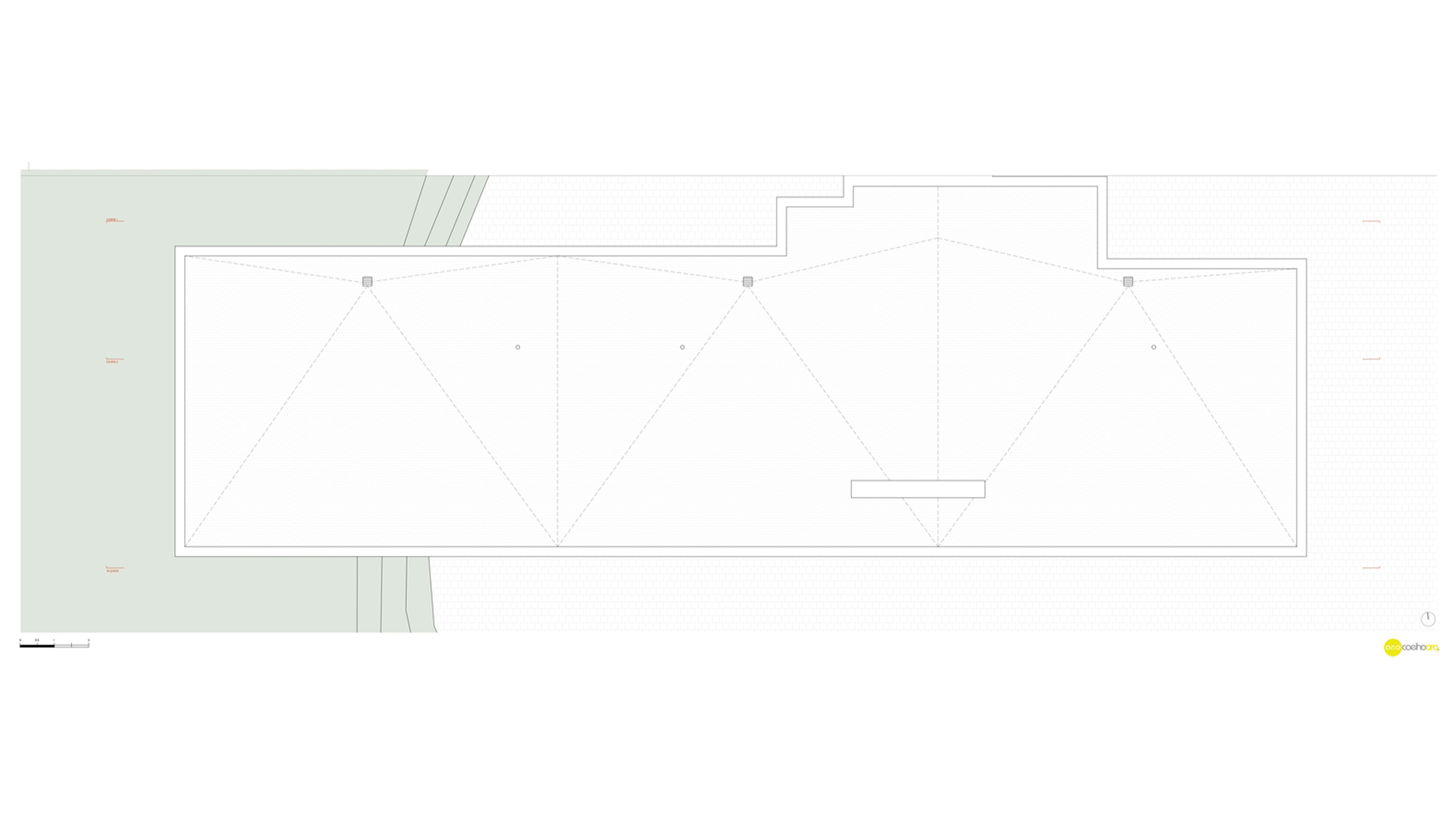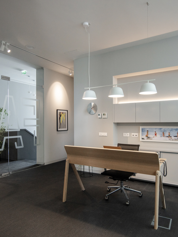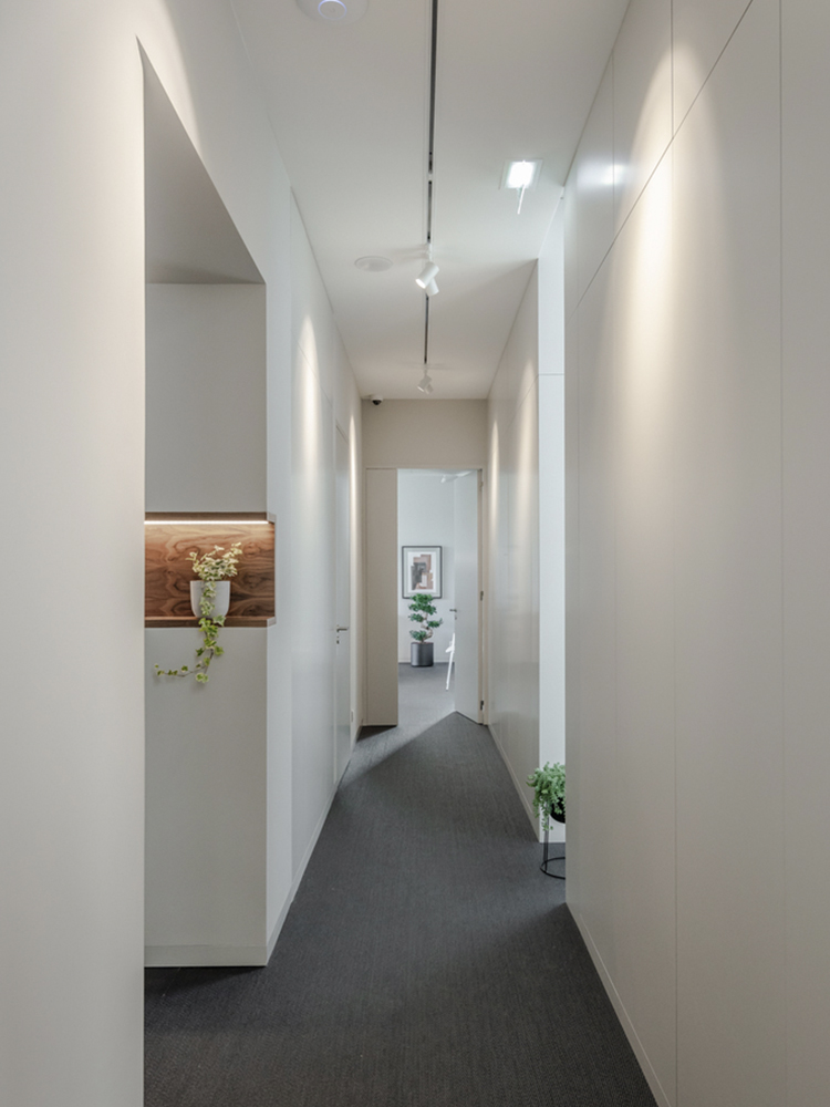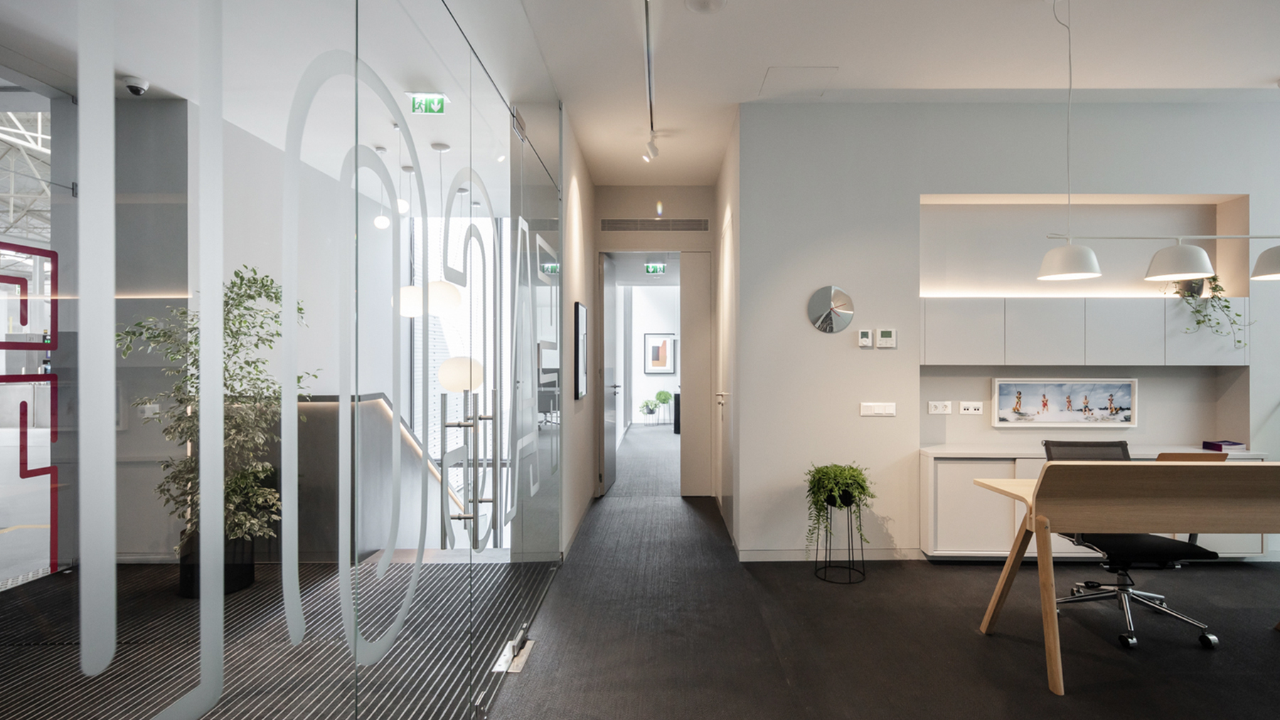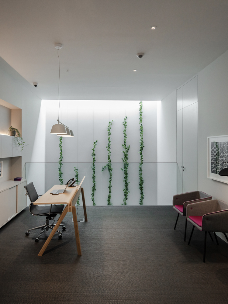 O edifício de escritórios surge como uma adição ao pavilhão inicial, ao qual se liga através de uma passagem generosa que concentra as circulações horizontais e verticais. Materializa-se num volume estendido de betão aparente, elevado sobre a zona de estacionamento que o serve.